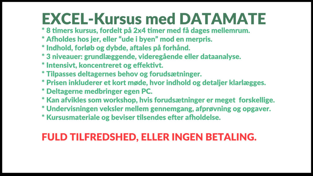 EXCEL-Kurser Tag EXCEL til næste niveau 8 timers kursus – 2×4 timer – uanset deltagerantal: 4.800,- kr alt inkl.